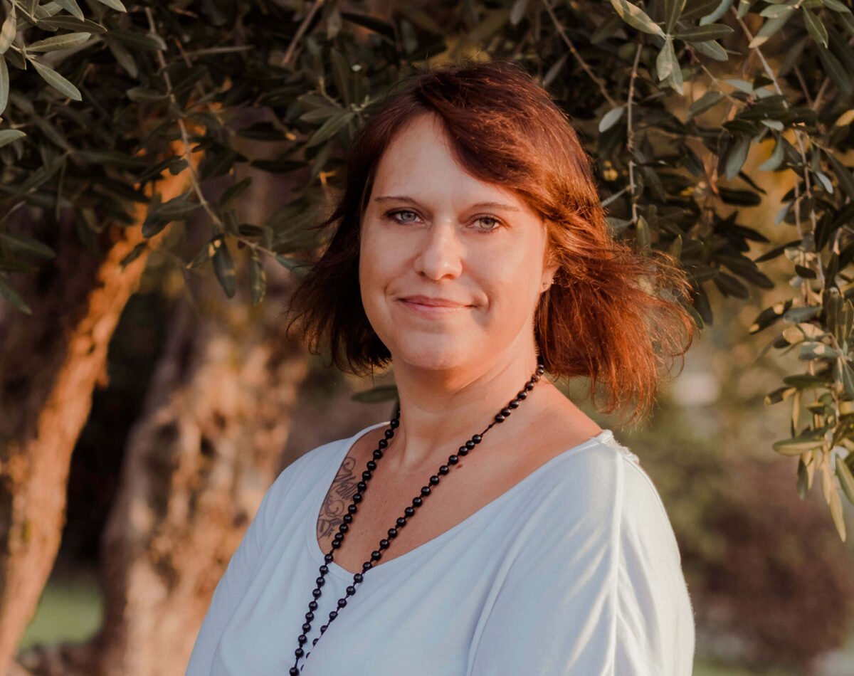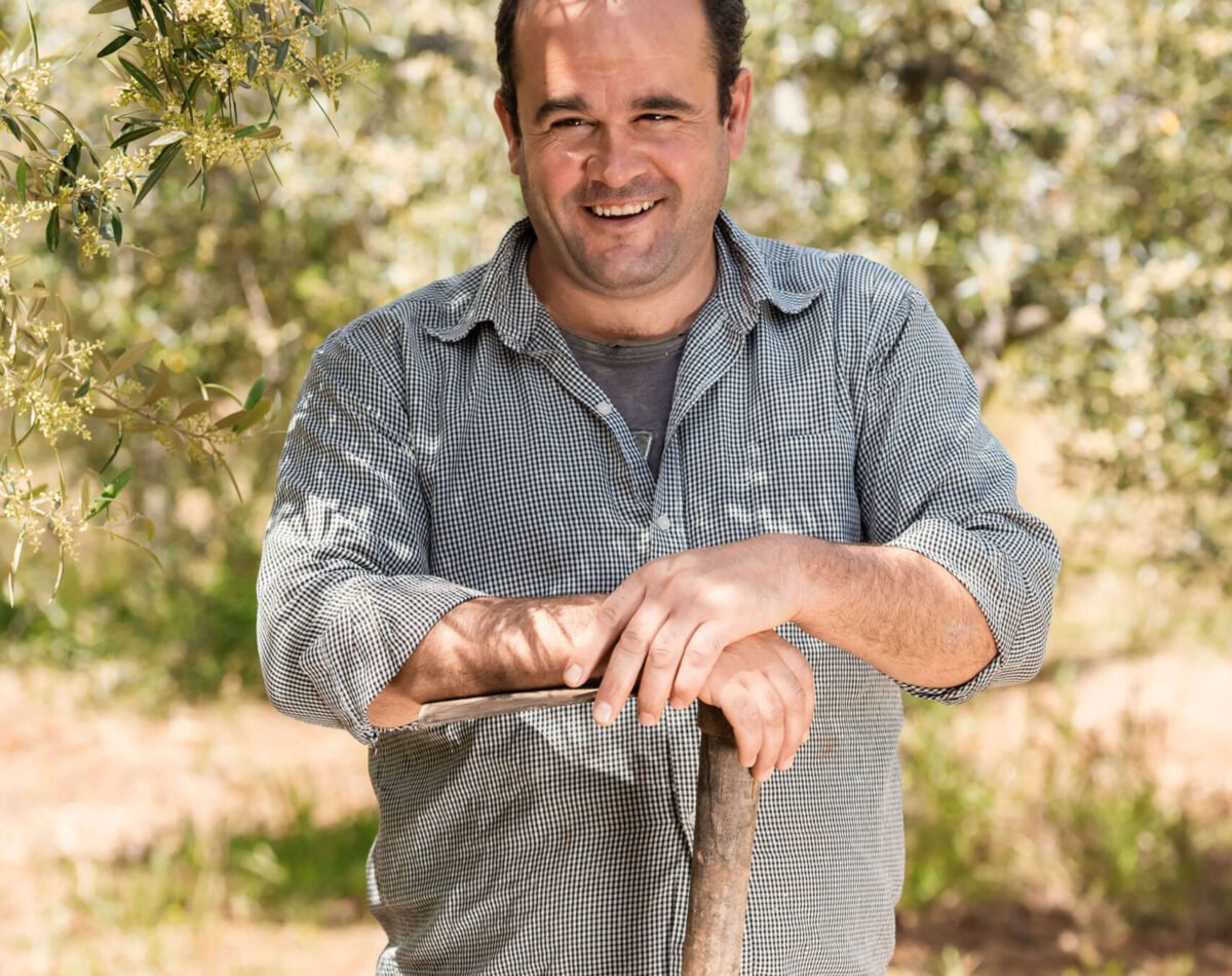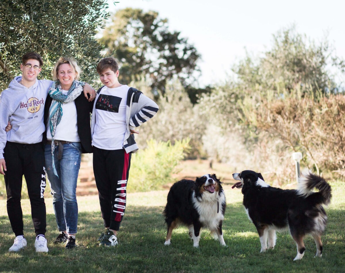 • our founder with two dogs in the olive garden at podere l'agave San Vincenzo